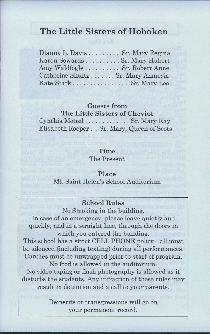 Seventeen high school students attended because the theater director at their high school, Dianna L. Davis, played Sister Mary Regina, the Mother Superior. I have a feeling they see her in an entirely new light.