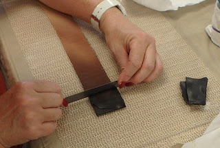 We chose three colors plus black cut in triangles to make our Skinner blends. Notice that each triangle is a different size. From left to right, black is the smallest, second color is much larger, the third color is largest of all and the fourth color is second smallest. (If you don't know how to make a Skinner blend, almost every polymer clay how-to book tells you how. I expect that you can find directions on the Internet also.)